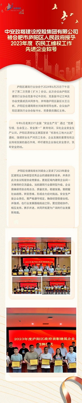 中安政楷建设控股集团有限公司被合肥市庐阳区人民政府授予2023年度 农民工维权工作 先进企业称号