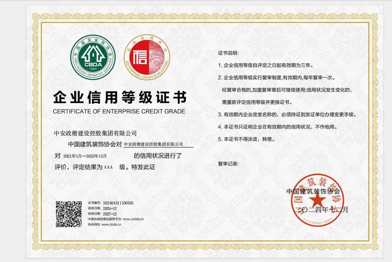 中国建筑装饰协会AAA级信用评价